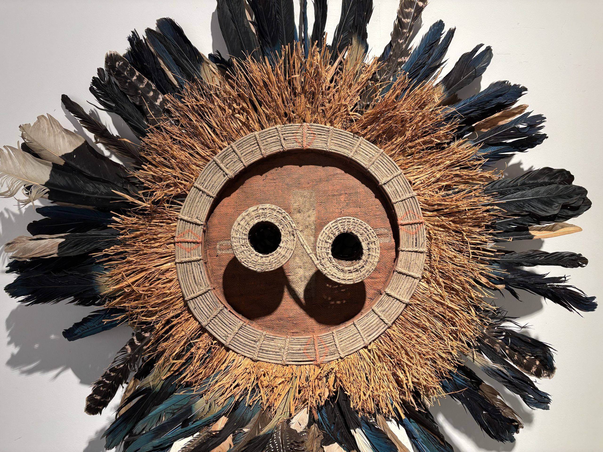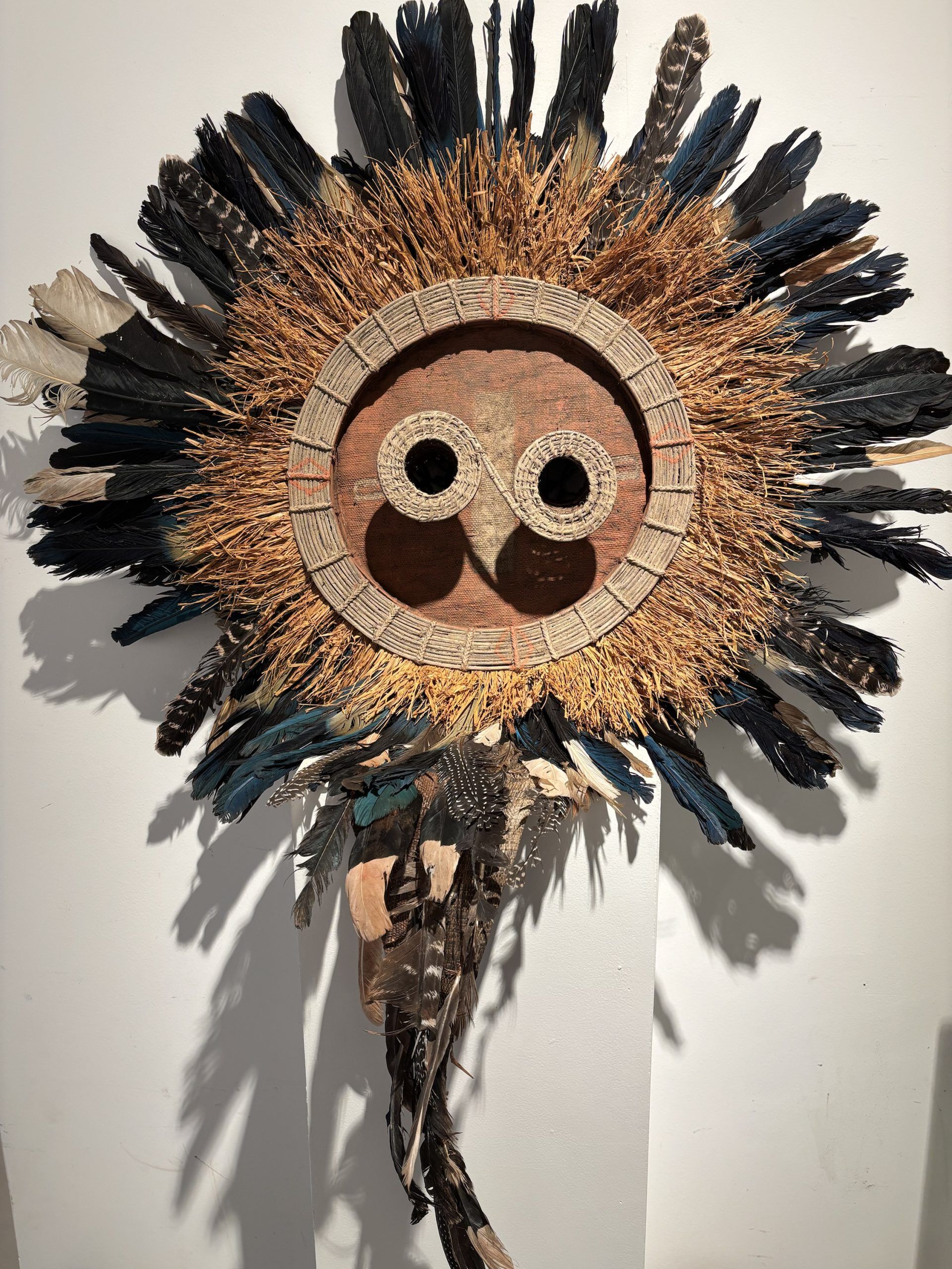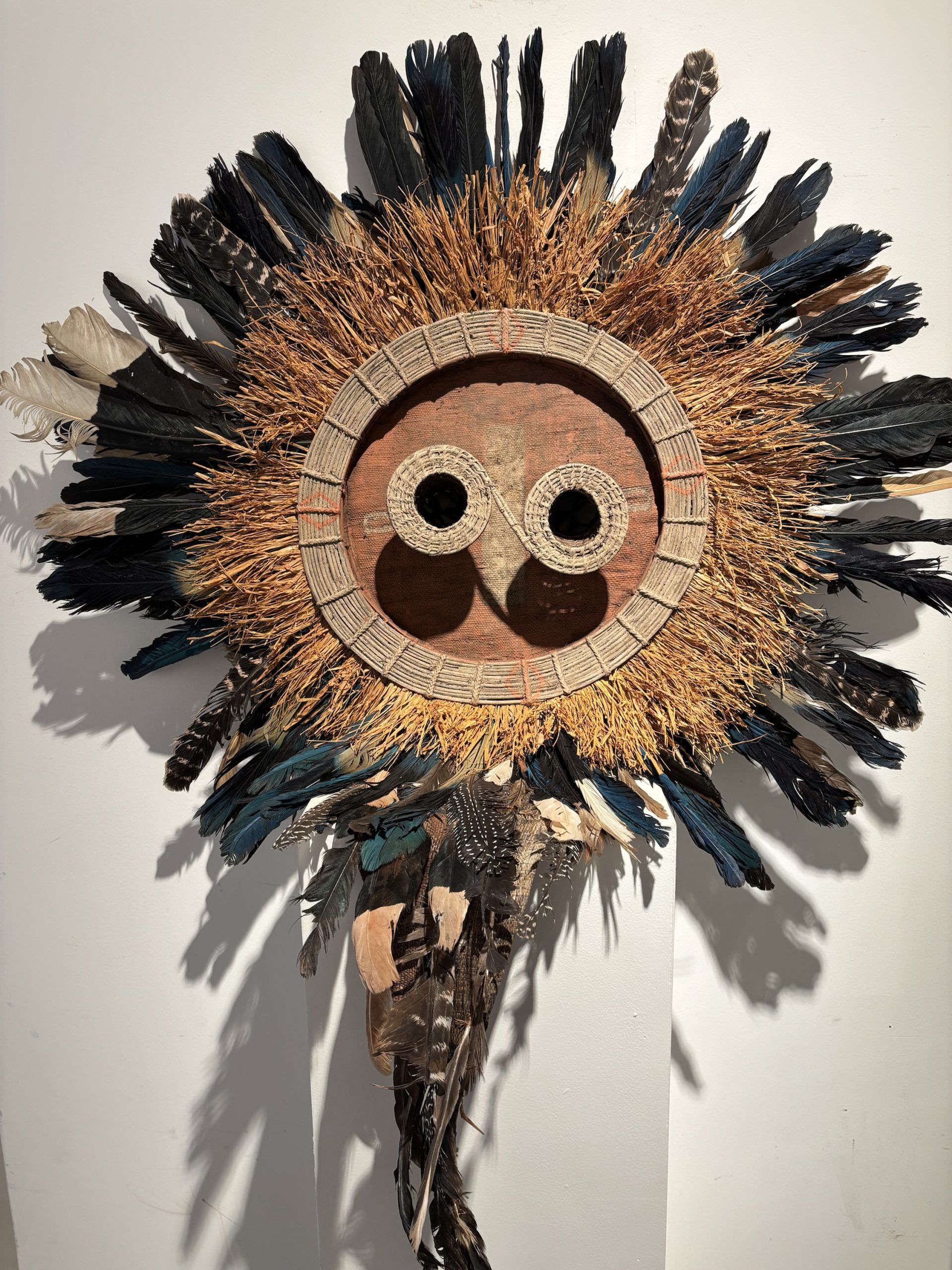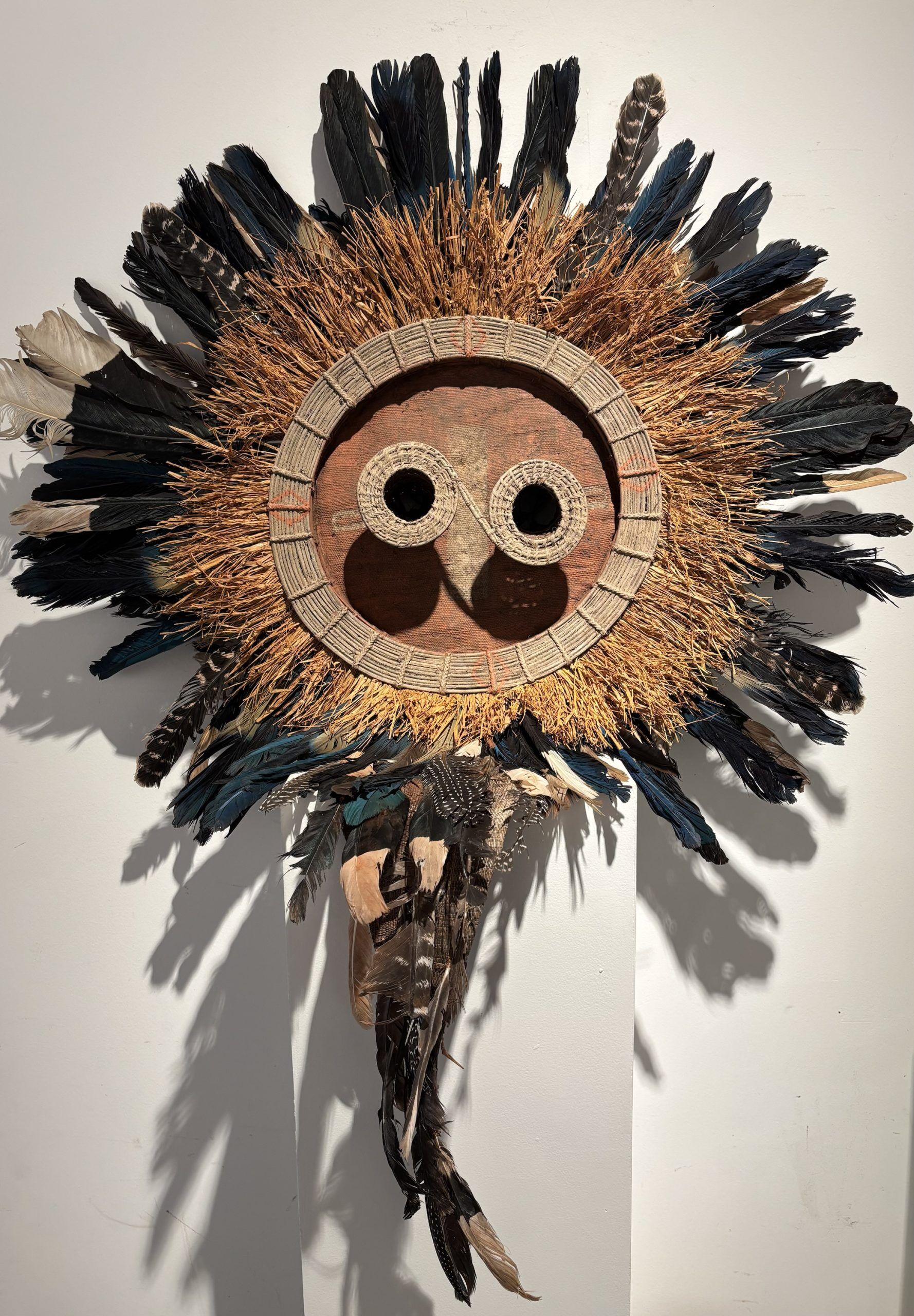 Très beau masque de danse de l’ethnie Pende (Sud Congo) de type Solaire en bois, plumes et fibres végétales